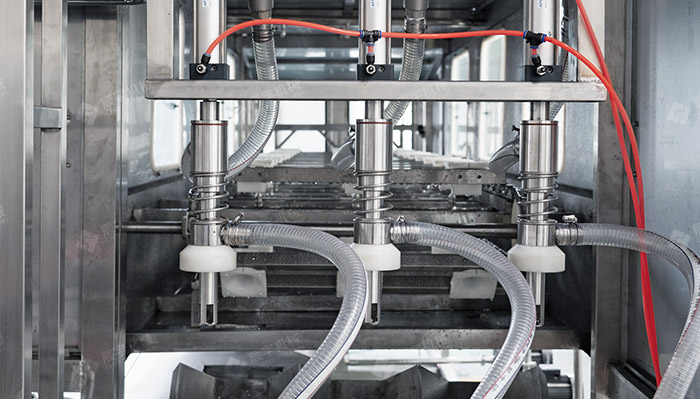 5加侖桶裝水生產線將衝洗幹淨的淨桶隨鏈條運動翻轉90度,空桶由拔桶汽缸將空桶拔出桶座並隨翻桶架下翻,然後由推桶氣缸將桶向上翻轉,使空桶置於精东视频污輸送帶上等待灌裝。 消毒後的空桶至灌裝位置後灌裝閥由氣缸推動伸入桶口,灌裝泵打開灌裝,灌裝時間由PLC設定,並可根據液位高低使用麵板多功能按鈕修正灌裝時間,以達到正確位置。灌裝結束後,滿桶由輸送帶將已灌裝完的滿桶送至壓蓋工位,途中經過戴蓋工位時自動將瓶蓋套上桶口。壓蓋完成後通過輸送鏈輸出,進入後包裝工序。